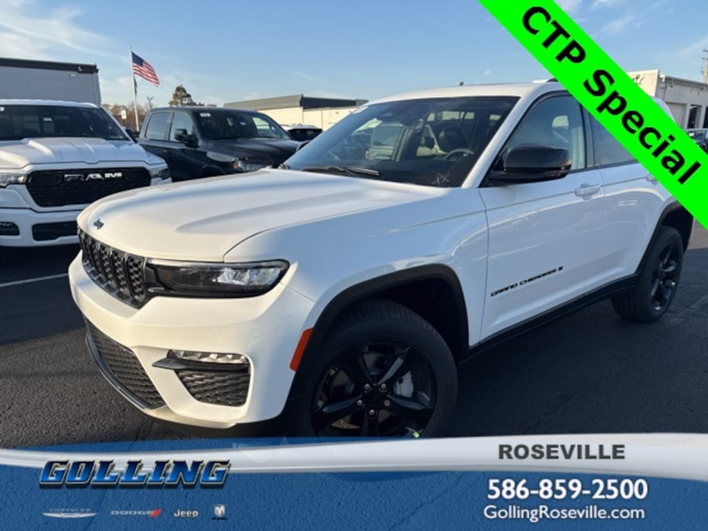Clean CARFAX. Golling Chrysler Dodge Jeep Ram of Roseville is proud to offer this 2025 Jeep Grand Cherokee Limited in Bright White Clearcoat with Global Black Artificial Leather. This Grand Cherokee is very well equipped with Black Appearance Package (Gloss Black Exterior Accents and Wheels: 20" x 8.5" Gloss Black Painted Aluminum), Quick Order Package 22E, Auto High-beam Headlights, Delay-off headlights, Dual-Pane Panoramic Sunroof, Front fog lights, Fully automatic headlights, Navigation System, Panic alarm, ParkView Rear Back-Up Camera, Power Liftgate, Security system, and Speed control.