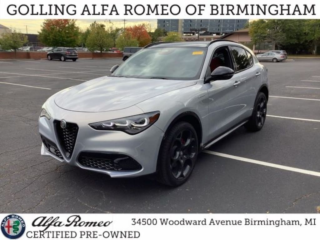 Golling Alfa Romeo of Birmingham is pumped up to offer this 2025 Alfa Romeo Stelvio Sprint in Moonlight Gray Metallic with Red Leather. This Stelvio is very well equipped with Sunroof (DISC) (Dual-Pane Sunroof and Gloss Black Window Surround Moldings), Veloce Package (DISC) (Front Strut Tower Brace, Gloss Red Calipers w/White Script, Limited Slip Differential Rear Axle, Power Adjust 8-Way Front Passenger Seat, Power Adjustable Bolster, Sport Leather Seats (DISC), Sport Rear Diffuser, and Volcano Black Body Kit), Heated front seats, Heated rear seats, Leather Seats, Navigation System, Power Liftgate, Red Leather Sport Seats, and Wheels: 21" x 8.5" Dark 5-Hole Aluminum (DISC).