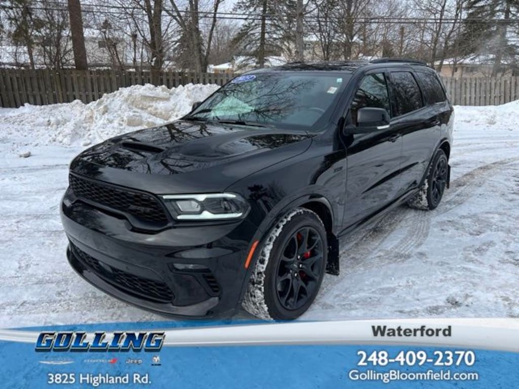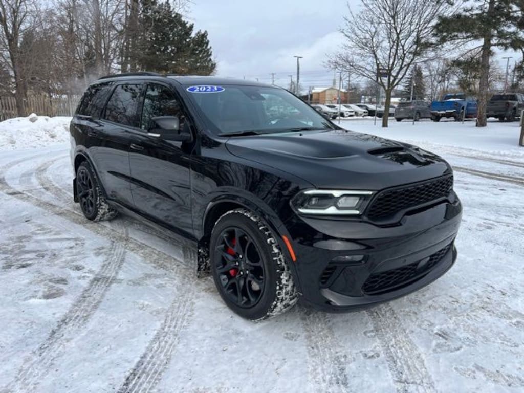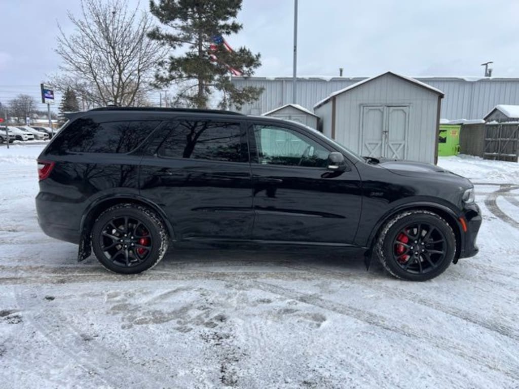 Accident Free Carfax History Report, Durango SRT 392, 4D Sport Utility, SRT HEMI 6.4L V8 MDS, 8-Speed Automatic, AWD, DB Black Crystal Clearcoat, Demonic Red/Black Leather, Wiring Harness 7 & 4 Pin, 1 USB Charging Port in Console, 12V Auxiliary Power Outlet In Console, 19 harman/kardon Amplified Speakers w/Subwoofer, 2 Pc Red Brembo Front Rotor Brakes, 2nd Row Console w/Armrest & Storage, 3rd Row Floor Mat & Full Console, 825 Watt Amplifier, 9 Speakers, Adaptive Cruise Control w/Stop, Advanced Brake Assist, Air Conditioning, Alloy wheels, AM/FM radio: SiriusXM w/360L, Apple CarPlay/Android Auto, Audio memory, Auto High-beam Headlights, Auto-dimming door mirrors, Auto-dimming Rear-View mirror, Automatic temperature control, Black Package, Black Roof Rails, Brake assist, Bumpers: body-color, Class IV Receiver Hitch, Compass, Delay-off headlights, Driver door bin, Driver vanity mirror, Eclipse Black Exhaust Tip, Electronic Stability Control, Forged Carbon Fiber Interior Accents, Four wheel independent suspension, Front dual zone A/C, Front fog lights, Front reading lights, Full Speed Forward Collision Warning Plus, Fully automatic headlights, Garage door transmitter, Gloss Black Exterior Mirrors, Gray Metallic Badges, Heated door mirrors, Heated steering wheel, High Performance Laguna Leather Seats, Illuminated entry, Illuminated Rear Cupholders, Integrated Roof Rail Crossbars, Lane Departure Warning Plus, Leather Shift Knob, Leather steering wheel, Memory seat, Navigation System, Navigation system: TomTom, Outside temperature display, Overhead console, Panic alarm, ParkView Rear Back-Up Camera, Passenger vanity mirror, Power door mirrors, Power driver seat, Power Liftgate, Power steering, Power Sunroof, Power windows, Premium Instrument Panel, Quick Order Package 29N SRT 392 Premium, Radio data system, Radio: Uconnect 5 Nav w/10.1" Display, Rain sensing wipers, Rear air conditioning, Rear reading lights, Rear window defroster, Rear window wiper, Red Seat Belts, Remote keyless entry, Satin Black Dodge Tail Lamp Badge, Security system, Speed-sensing steering, Spoiler, Sport steering wheel, Steering wheel mounted audio controls, Tachometer, Telescoping steering wheel, Tilt steering wheel, Traction control, Trailer Brake Control, Trip computer, Turn signal indicator mirrors, Voltmeter, Wheels: 20" x 10" Lights Out Aluminum. Clean CARFAX.