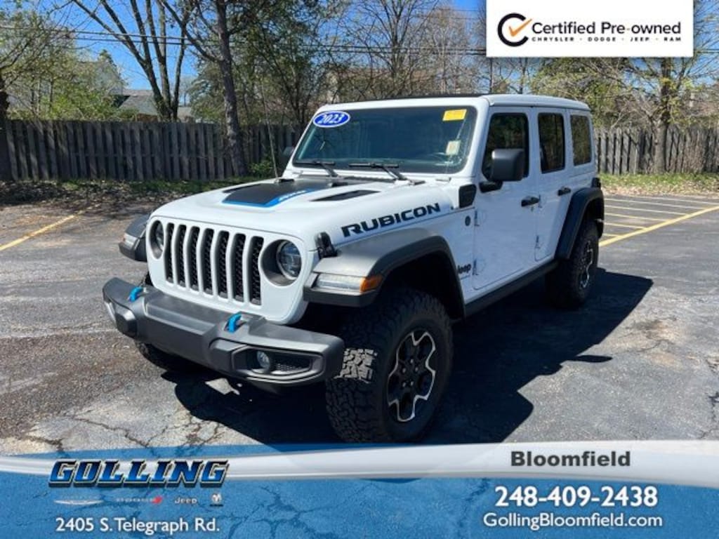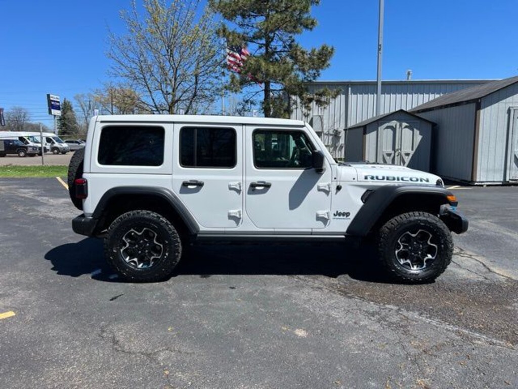 Accident Free Carfax History Report, Carfax One Owner!!, JD Power retail is $39,275!, Wrangler Rubicon 4xe Sky 1-Touch Power Top, 4D Sport Utility, 2.0L I4 DOHC, 8-Speed Automatic, 4WD, Bright White Clearcoat, Black w/Leather Trimmed Bucket Seats, Wiring Harness 7 & 4 Pin, 700 Amp Maintenance Free Battery, 9 Speakers, ABS brakes, Alloy wheels, AM/FM radio: SiriusXM, Apple CarPlay/Android Auto, Auto-dimming Rear-View mirror, Auxiliary Switches, Brake assist, Class II Receiver Hitch, Cold Weather Group, Compass, Electronic Stability Control, Front dual zone A/C, Front reading lights, Garage door transmitter, Heated door mirrors, Heated Front Seats, Heated Steering Wheel, Illuminated entry, Low tire pressure warning, Navigation System, ParkView Rear Back-Up Camera, Passenger door bin, Power door mirrors, Power Top Quarter Window Storage Bag, Quick Order Package 29V Rubicon, Radio data system, Radio: Uconnect 4C Nav w/8.4" Display, Rear reading lights, Rear Window Defroster, Rear Window Wiper/Washer, Remote keyless entry, Remote Start System, Removable Rear Quarter Windows, Sky 1-Touch Power Top, Tachometer, Telescoping steering wheel, Traction control, Trailer Tow & Aux Switch Group. CARFAX One-Owner. Clean CARFAX.